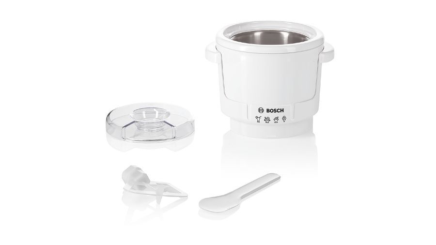 Çift cidarlı soğutma kabı Maks. Soğutma ünitesi başına 550 g dondurma Emniyet kaplinli çırpıcı Kavrama ağızlı soğutma kapları için bağlantı parçası Huni ile sıçrama önleyici kapak Spatula